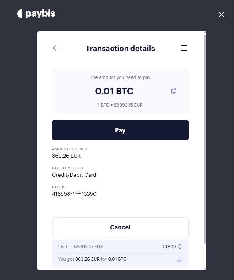 Paybis returns the transaction info necessary to make a payment: cryptocurrency, amount, destination wallet, blockchain, and network.